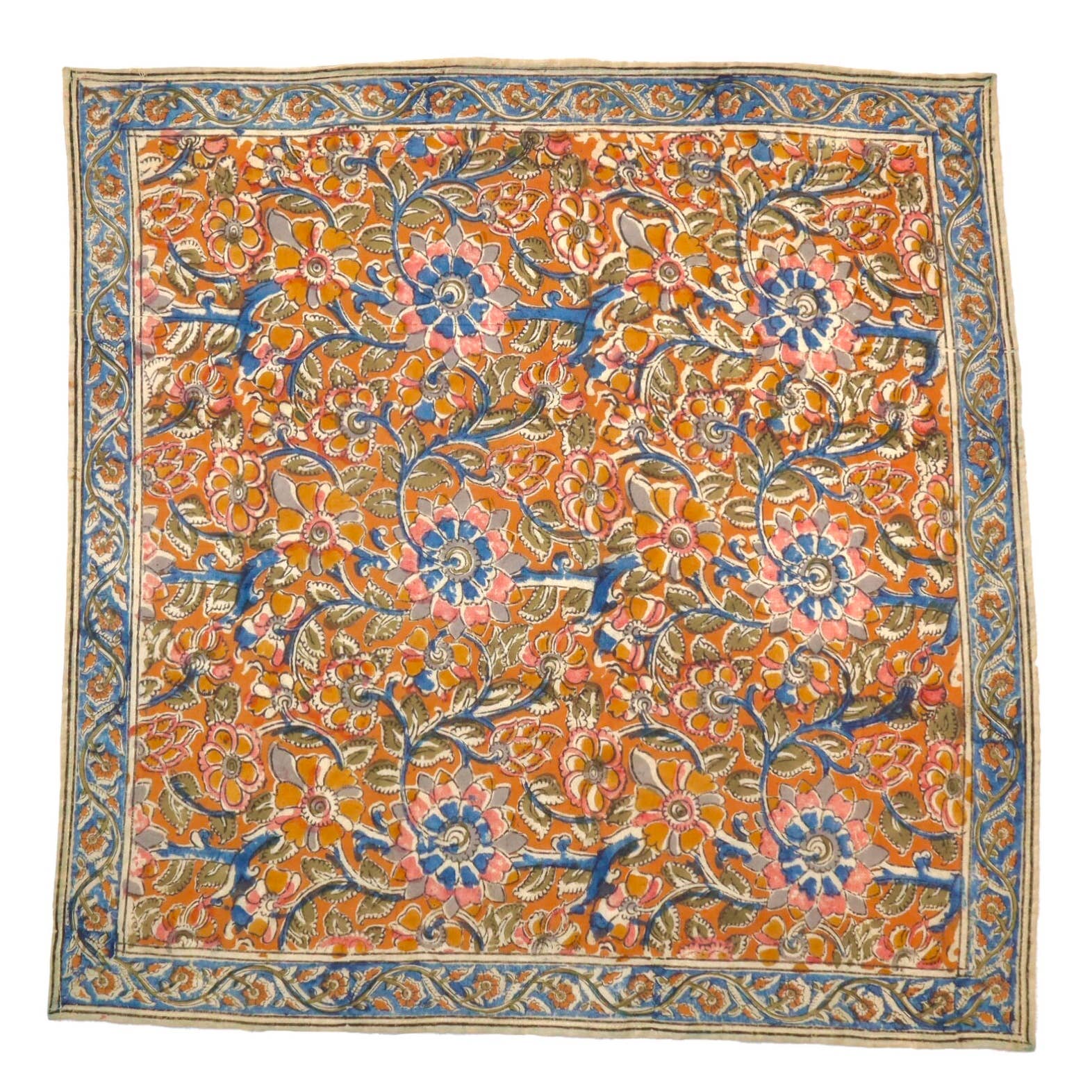 The "Cobalt Floral" Bandana showcases vibrant floral patterns in shades of pink and blue, set against a rich copper background. Handcrafted using natural vegetable dyes, this bandana embodies sustainable fashion with a timeless design. The lightweight voile cotton provides a soft and breathable accessory, perfect for all-day wear.