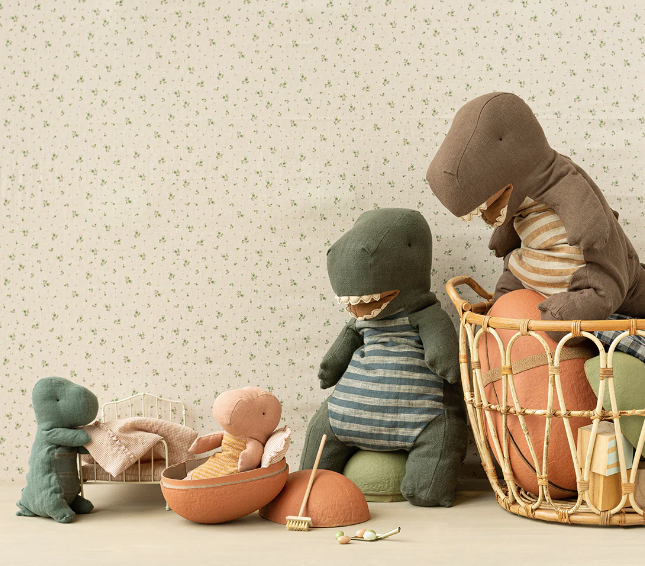 Look at this funny friend! A large Gantosaurus with big teeth has arrived and is ready to play with all of us. It is made in a soft mix of ramie and cotton, the striped stomach is made in a very nice blend of linen and cotton.
