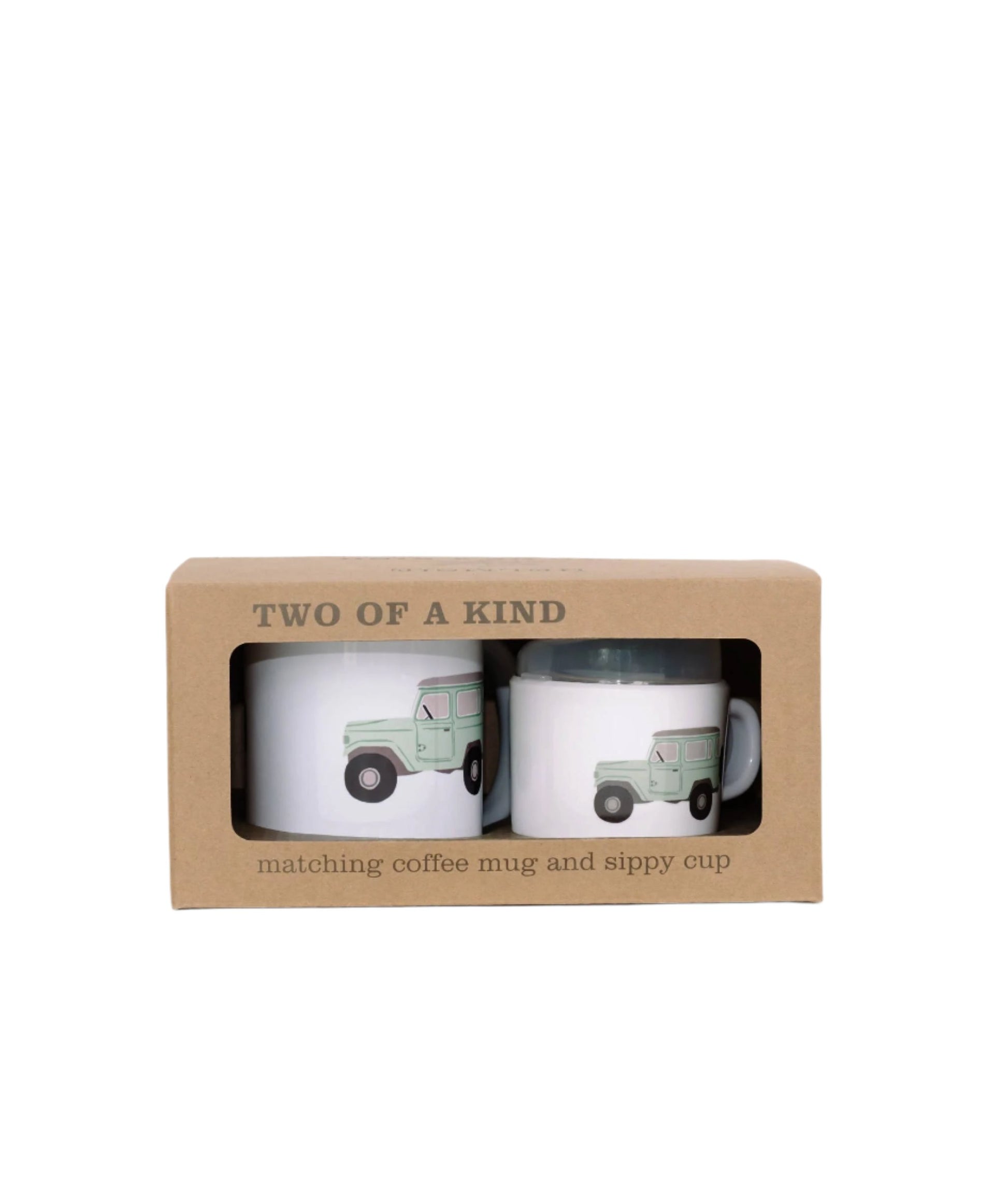 Coordinating mug for Dada (or anyone really!) and sippy cup for babe featuring a classic Landcruiser FJ40 in mint green. Every child, and most Dad friends, want to take it for a spin when they visit. The sippy cup has a removable top that can be set aside when it is time to transition to a toddler mug. We are very proud of this easy to clean melamine mug. Not only does it come in a pattern that mama will enjoy, the top is easy and fast to push onto the mug and stays sealed! The design will the dishwasher and stay bright and cheery too! Sippy cup is 100% melamine. BPA free.